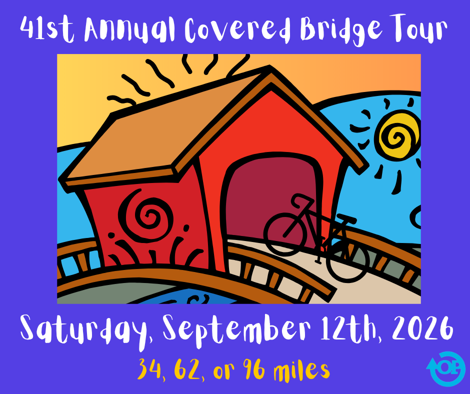 Our popular Covered Bridge Tour is an exceptionally good training ride for the fall! Yes, there are mileage options: we offer three routes of 34, 62, or 96 miles, with elevation gains of 1200, 2800, and 4000 ft respectively. A summer of riding has made you strong, so you can do this!